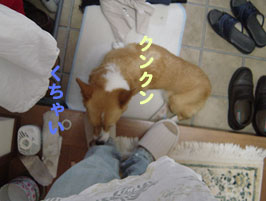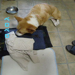 | なんだようそんなカワイコな行動にでちゃってかわいいヤツめ! でもこのGパン臭いよ。洗っても洗ってもファ○リーズしても臭いGパン。最近やっとマシになってきたけど犬には臭うだろうな~ |