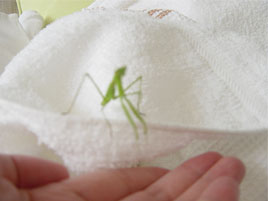 | 洗濯物を干すときにいたカマキリがたたむときまぎれてました。 初めて触ったのですが手のひらに乗ったら肩まで上ってきて…カワイイな。 |